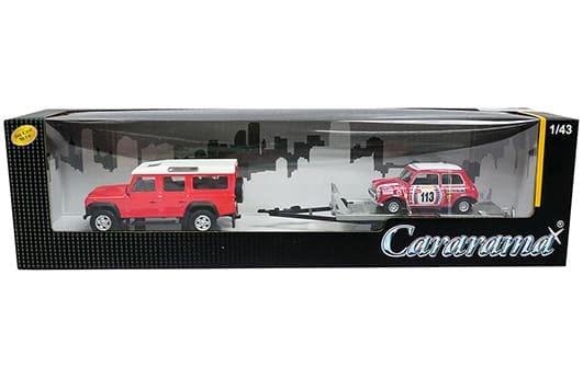 Cararama 1:43 Land Rover Defender 110 with Trailer and Mini Cooper British Racing #113 (Red/White)