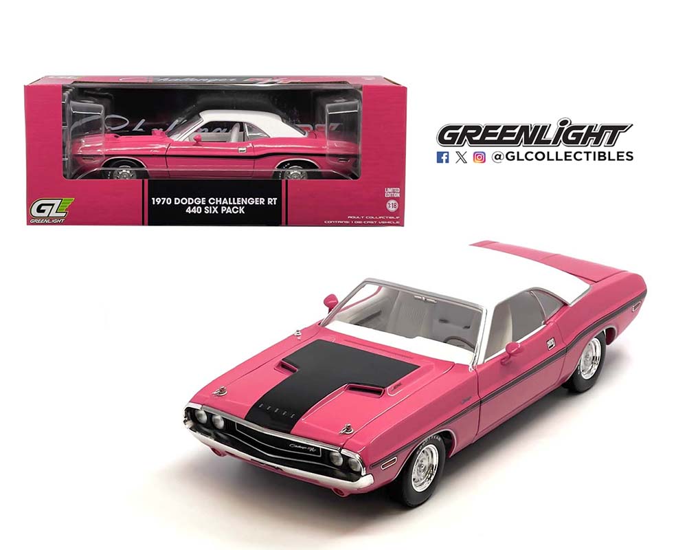 Greenlight 1:18 1970 Dodge Challenger RT Hard Top 440 Six Pack – Panther Pink with White Top
