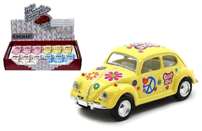 Kinsmart 1:64 1967 Volkswagen Classical Beetle with Pastel Peace Decal 2″ – Display Tray Set of 12