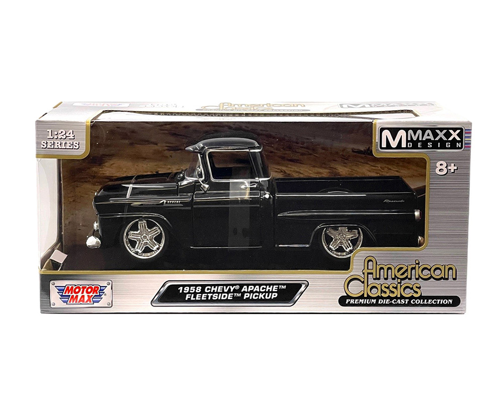 Motormax 1:24 1958 Chevrolet Apache Fleetside Pickup with Custom Wheels – Black – American Classics Mmaxx Design