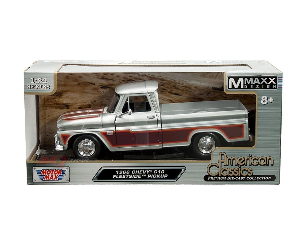 Motormax 1:24 1966 Chevrolet C10 Fleetside Pickup – Silver with Burgundy/Red/Orange – American Classics MMAXX Design