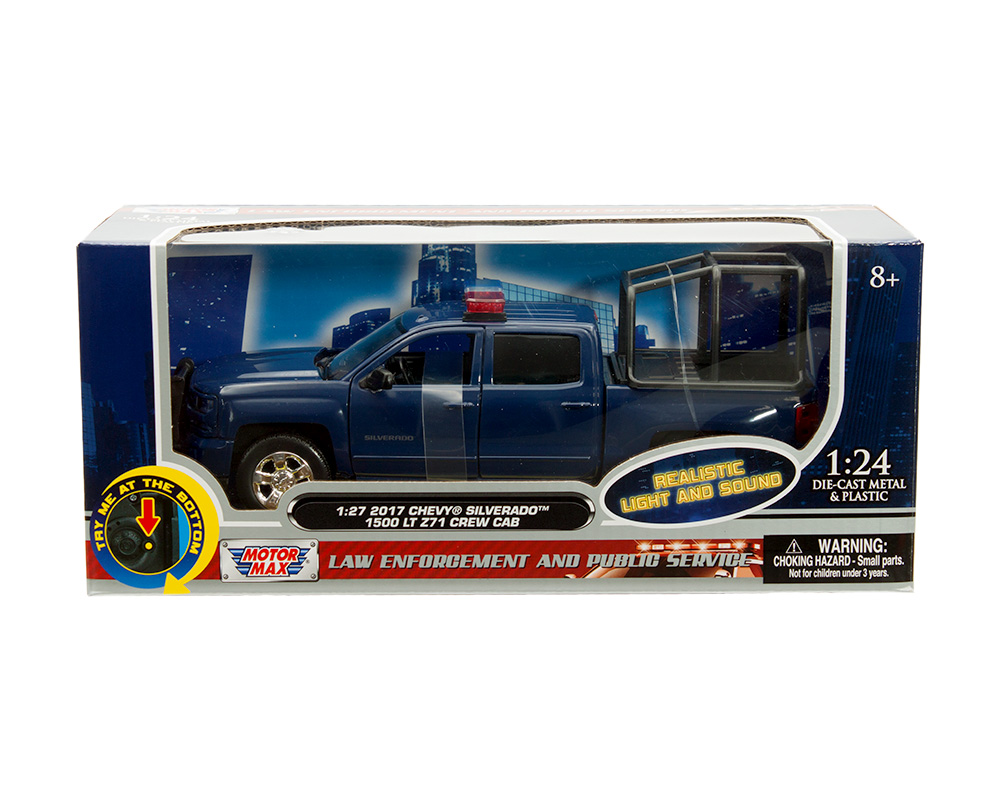 Motormax 1:27 2017 Chevrolet Silverado 1500 LT Z71 Crew Cab with Stand Cage – Blue – Light and Sound – Law Enforcement and Public Service
