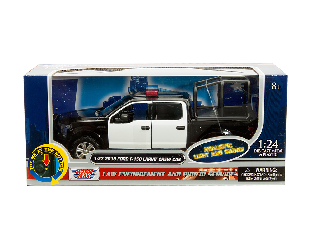 Motormax 1:27 2019 Ford F-150 Lariat Crew Cab with Stand Cage – Black/White – Light and Sound – Law Enforcement and Public Service