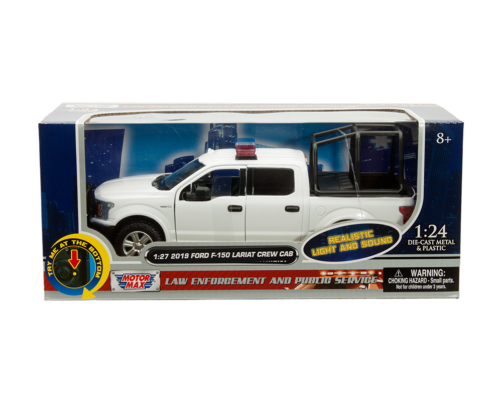 Motormax 1:27 2019 Ford F-150 Lariat Crew Cab with Stand Cage – White – Light and Sound – Law Enforcement and Public Service