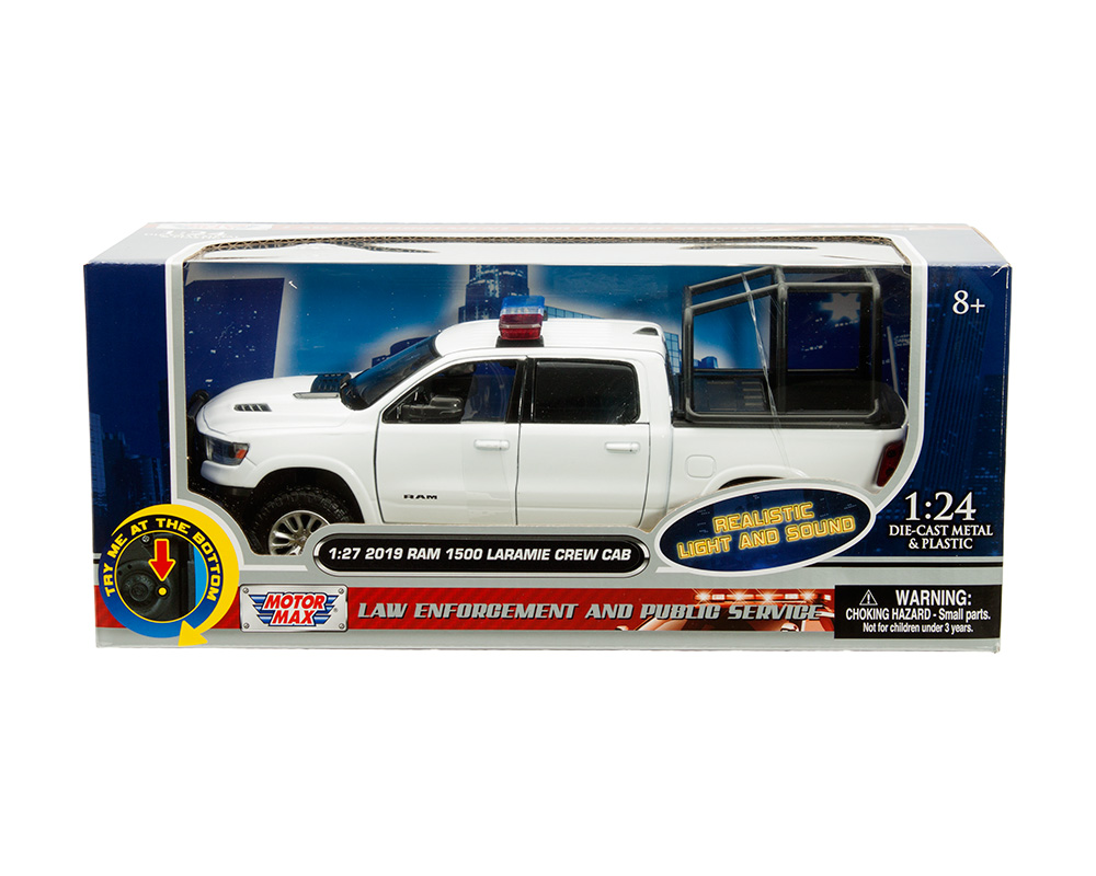 Motormax 1:27 2019 Ram 1500 Laramie Crew Cab with Stand Cage – White – Light and Sound – Law Enforcement and Public Service