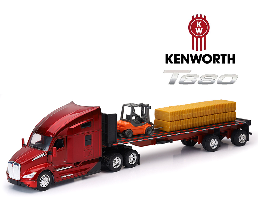 New Ray 1:32 Kenworth T680 1:32 Kenworth T680 Flatbed w/ Hay & Forklift – Red – Long Haul Truckers